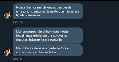 – Primeiro: o outro grupo que existia da emissora era a câmara, justamente pra avaliar as obras e o rendimento dos autores. Ele não foi criado com a intenção de ser especificado pra falar mal de nenhum dos autores. Ao longo do tempo, claro, ele acabou sendo usado pra comentar outros assuntos. Óbvio, havia momentos que a gente comentava sobre a produtividade de tal autor. Sobre os citados, eu não tenho nada pra falar. São meus amigos e eu me divido entre o aster e o ultra.